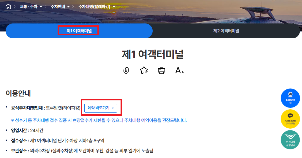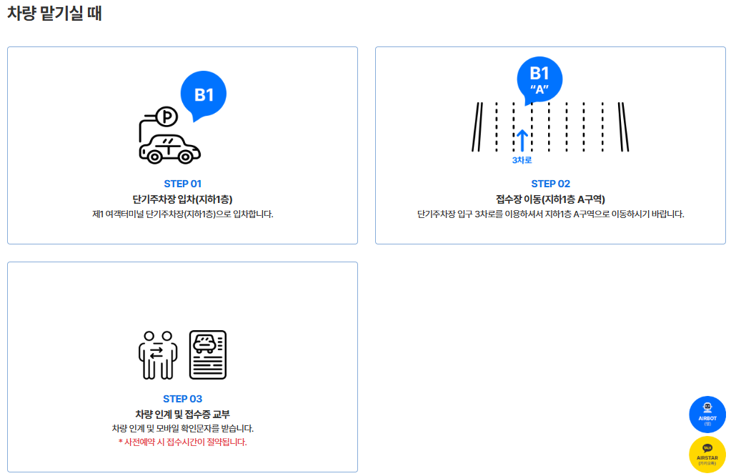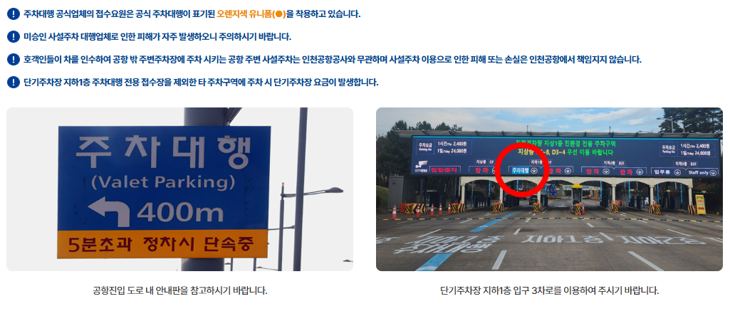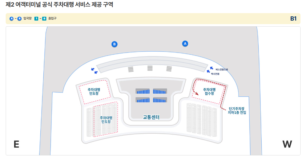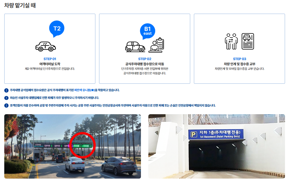 | 발렛 위치 | T1: 제1 여객터미널 단기주차장 지하1층 A구역 / T2: 제2 여객터미널 교통센터 지하1층 서편 (단기주차장 진입부) |