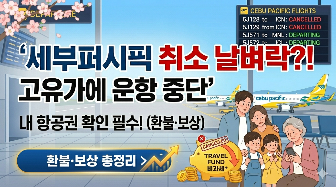 안녕하세요! 최근 필리핀 여행의 필수 노선인 **세부퍼시픽(Cebu Pacific)**의 운항 스케줄이 갑자기 변경되거나 취소되는 사례가 속출하고 있습니다.