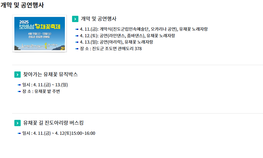 - 축제명: 2025 진도 보배섬 유채꽃 마을축제