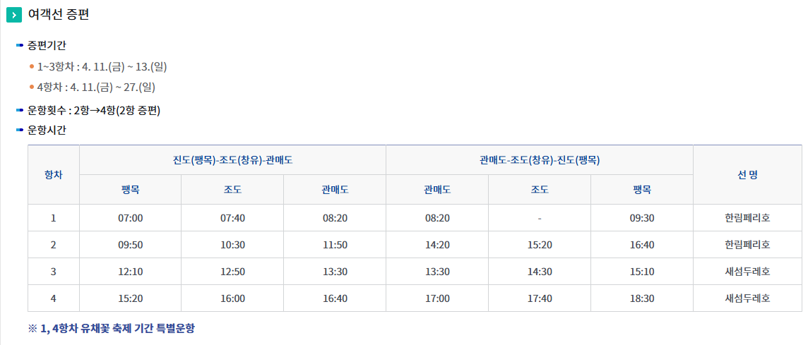 - 여객선 시간표는 진도 여객선터미널 홈페이지 또는 전화로 확인 필수