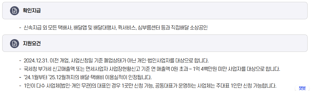 - 확인지급 대상자의 경우 [소상공인배달택배비지원.kr] 또는 [소상공인24] 홈페이지 통해 신청
