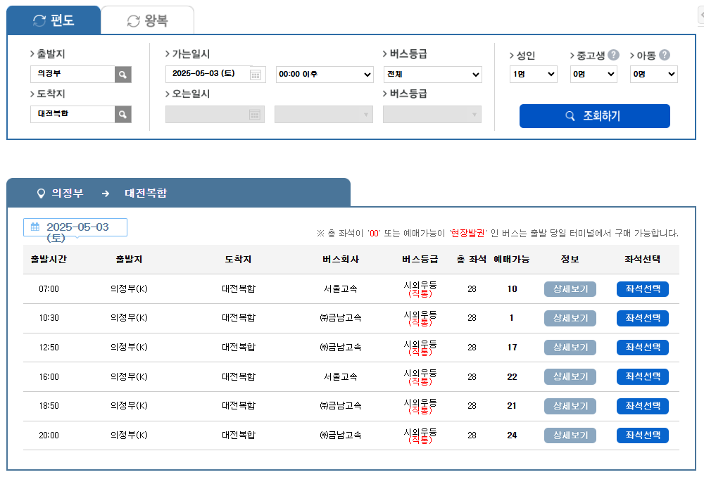 - 출발지, 도착지, 출발일을 입력하여 버스 시간을 조회합니다.