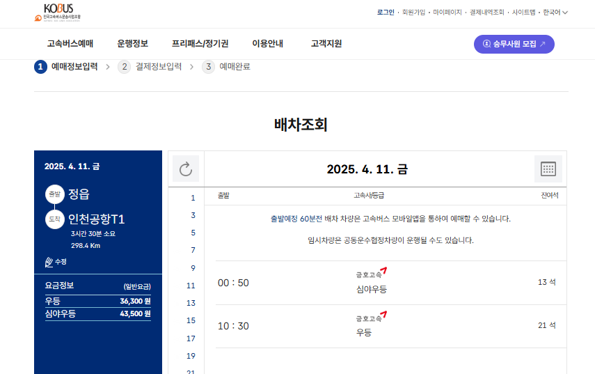 이 글에서는 정읍 → 인천공항 노선의 시간표 확인 방법, 예매 절차, 예약 취소까지 한 번에 정리해드릴게요!