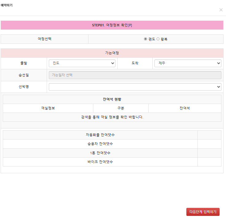 - 출발지/도착지 선택 (진도항 ↔ 제주항)