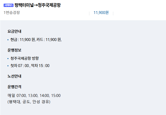 - 평택시외버스터미널 ↔ 청주국제공항: 11,900원