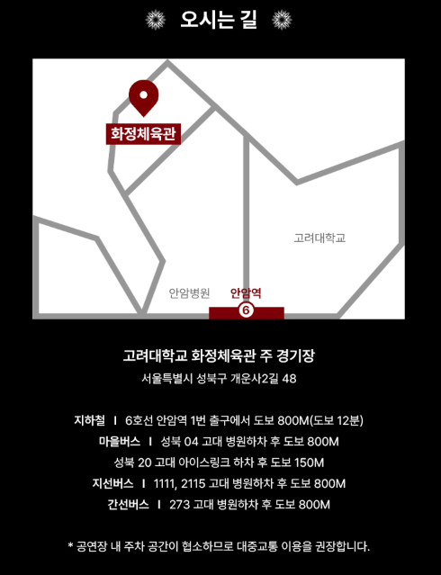 - 지하철: 6호선 안암역 1번 출구 → 도보 12분