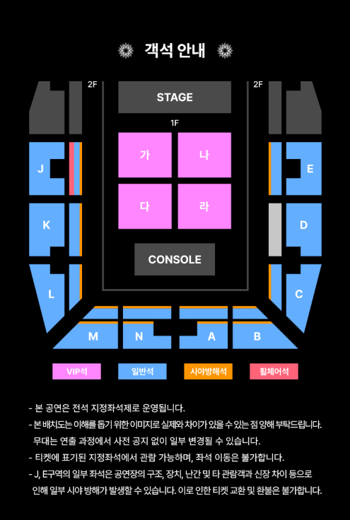 특정 좌석에서는 기둥, 조명, 장비 등으로 인해 무대 시야가 가려질 수 있습니다.