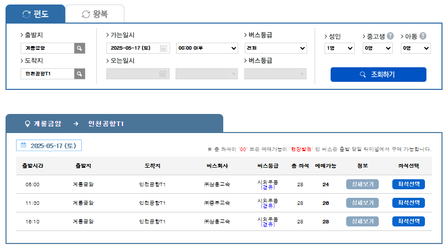 - 출발지: 계룡 / 도착지: 서울남부 또는 인천공항 선택