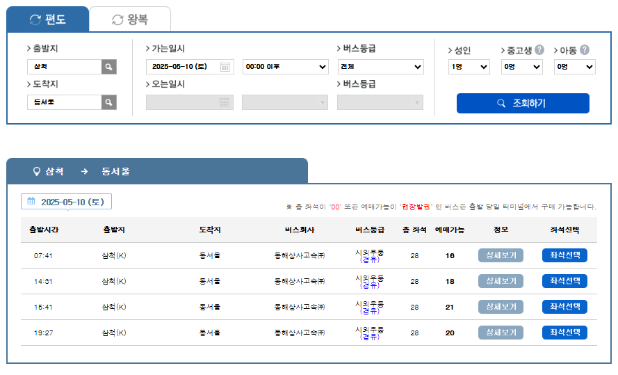 - 출발지: 삼척, 도착지: 원하는 지역 입력