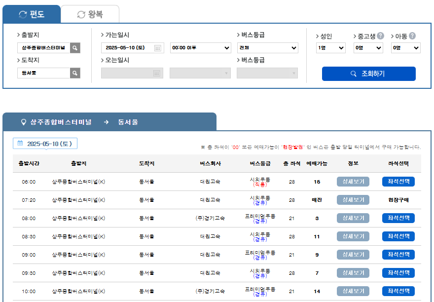 - 출발지: 상주 / 도착지: 원하는 지역 입력