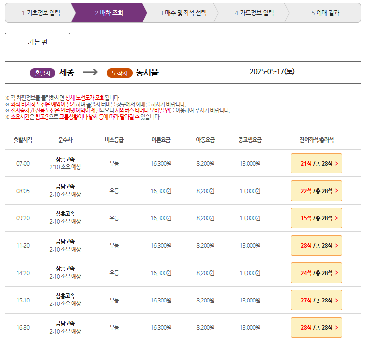 - 출발지에 세종, 도착지와 날짜 선택