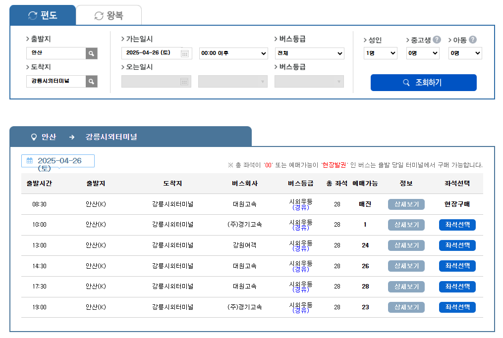 - 출발지, 도착지, 출발일을 입력하여 버스 시간을 조회합니다.