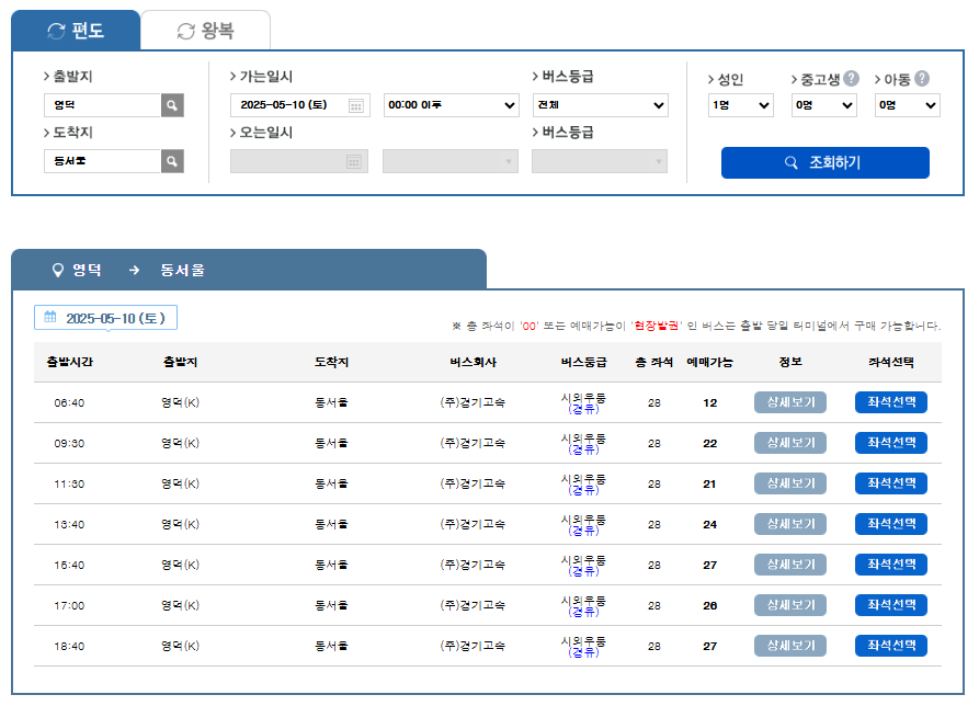 - 출발지, 도착지, 출발일을 입력하여 버스 시간을 조회합니다.