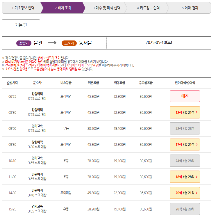 - 출발지: 울진 / 도착지 입력 (예: 동서울, 대구, 포항 등)
