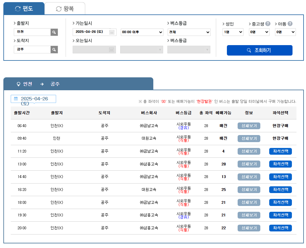 - 출발지, 도착지, 출발일을 입력하여 버스 시간을 조회합니다.