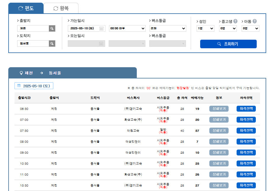 - 출발지: 제천, 도착지 입력 (예: 동서울, 원주, 강릉 등)