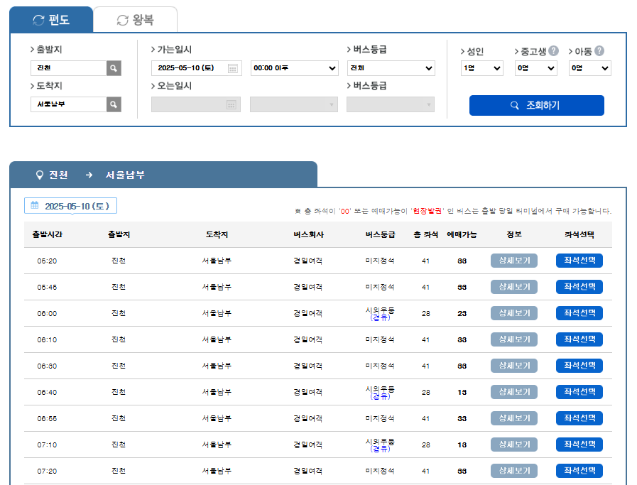- 출발지, 도착지, 출발일을 입력하여 버스 시간을 조회합니다.