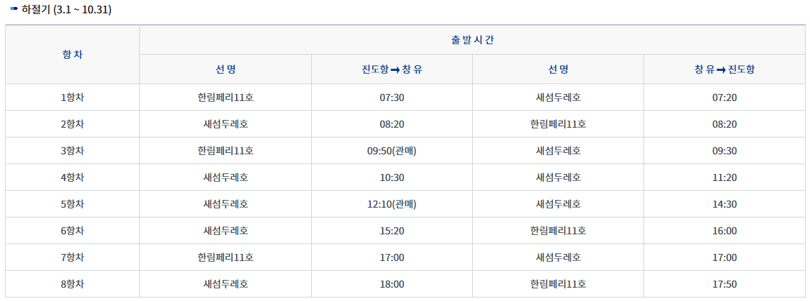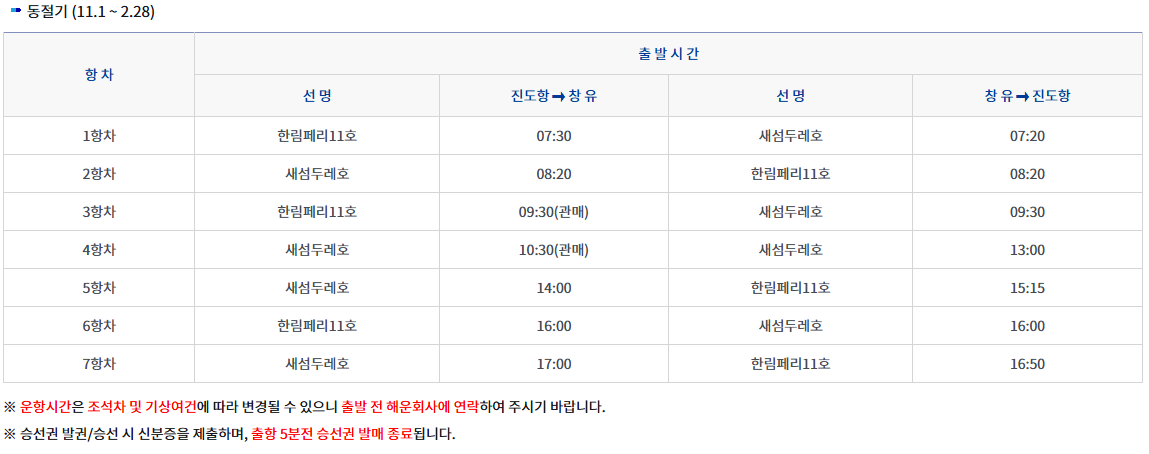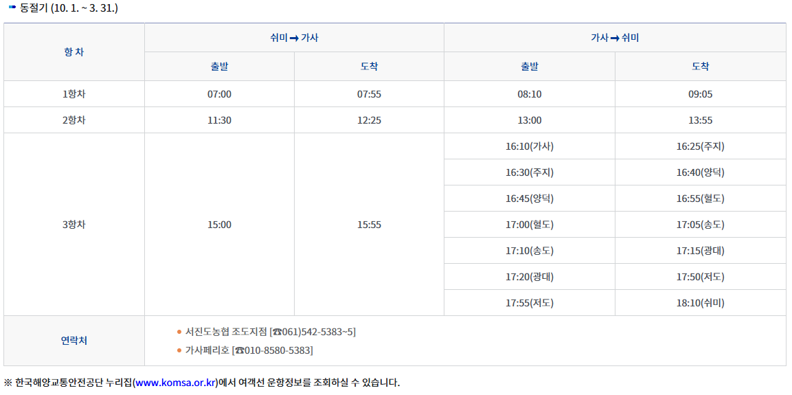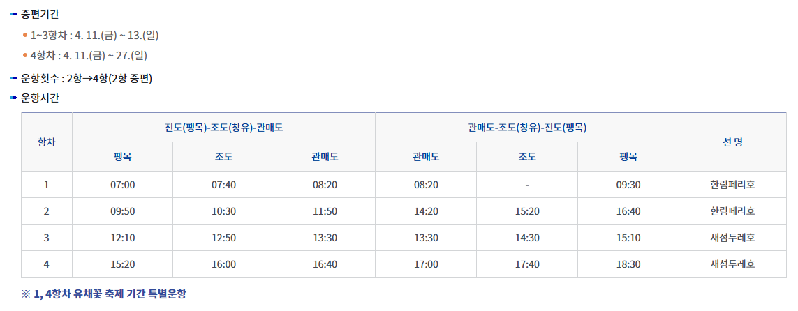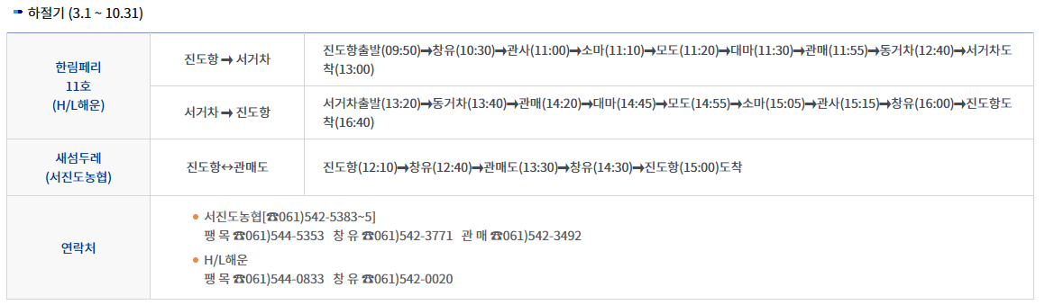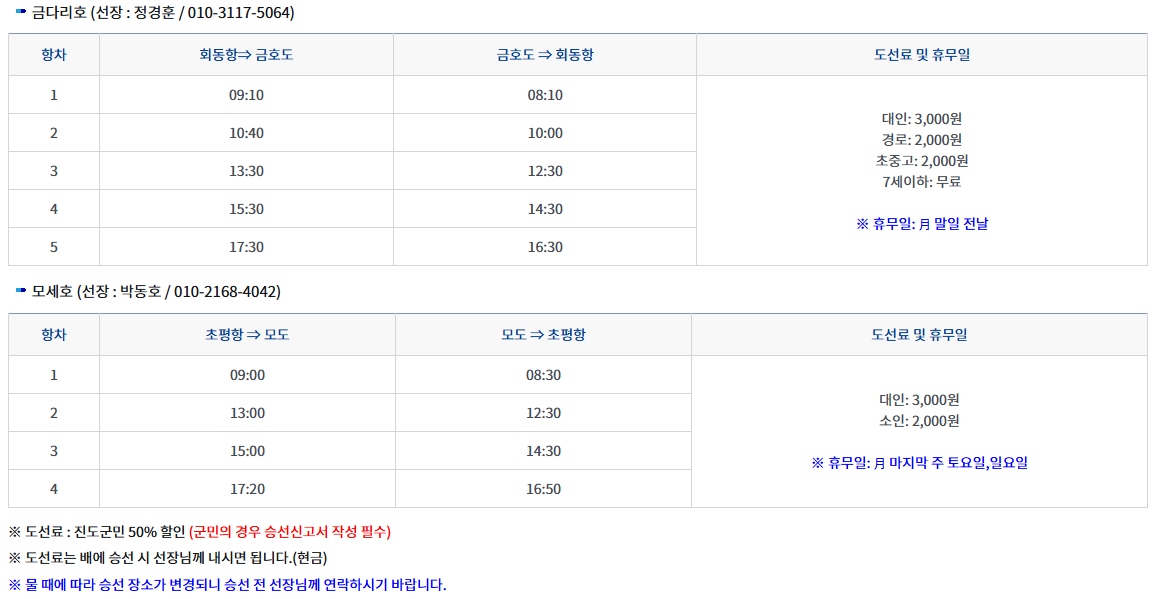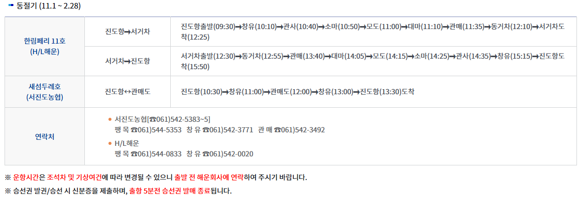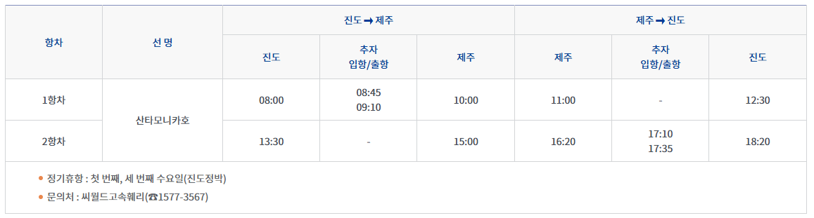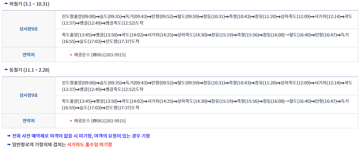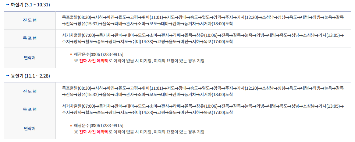 👉 여객선운항시간표 : 진도군 관광문화 - 상단 메뉴 → 여행정보 → 여객선 시간표