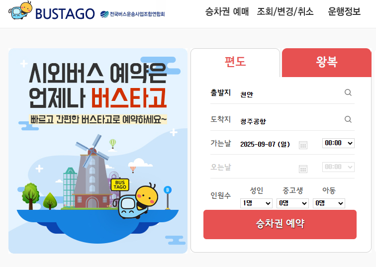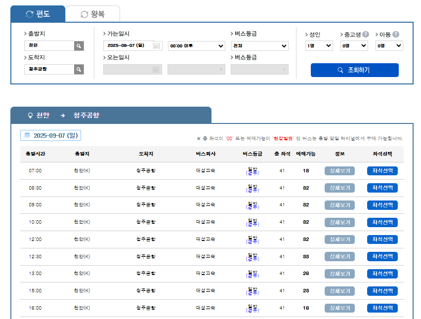 - 탑승 장소: 천안종합버스터미널 3번 승강장